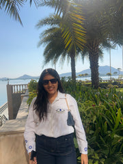 Our “Nazar Battu Shirt” is crafted in breathable linen fabric which comes with an inner lining for an effortless, polished look. It features a statement hand embroidered eye patch on the front, symbolizing protection. The sleeves are detailed with delicate evil eye circle embroidery, adding a subtle yet striking touch.